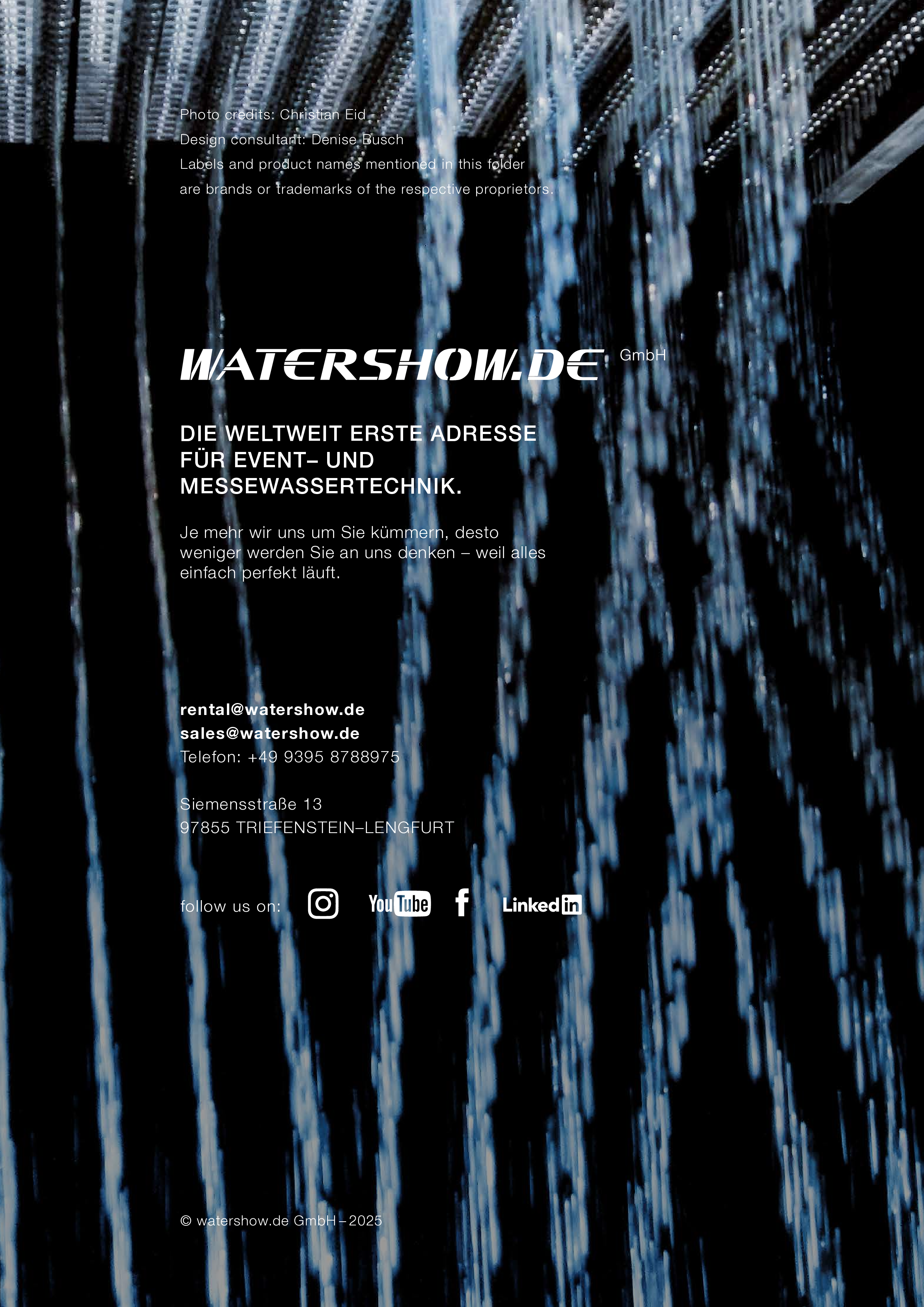 Watershow.de GmbH verwandelt Wasser in unvergessliche Erlebnisse. Von funkelnden Fontänen und eleganten Wasserwänden bis hin zu hochmodernen Wasserscreens, die Logos und Bilder mit fallenden Tropfen schreiben. Jede Show ist ein einzigartiges Highlight. Mit individuellen Lösungen, perfekter Technik und beeindruckender visueller Wirkung lässt Watershow.de Marken erstrahlen und Events unvergesslich werden.